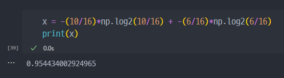 Entropy =[ -10/16 X log_2(10/16) ] + [ - 6/16 X log_2(6/16) ] = 0.954...