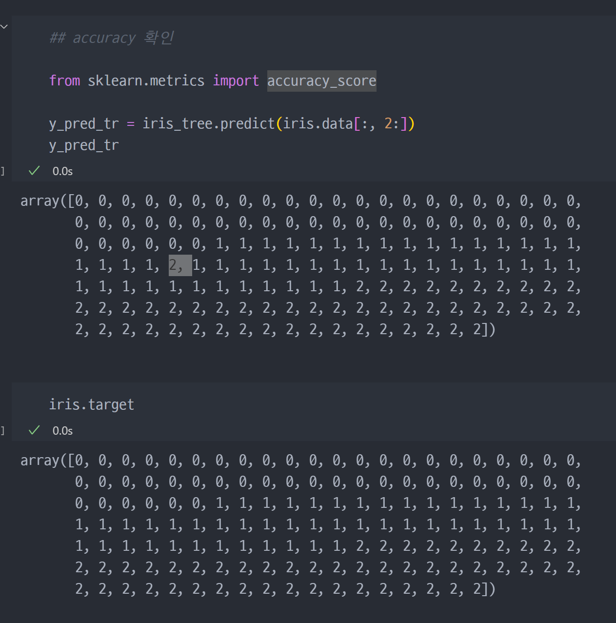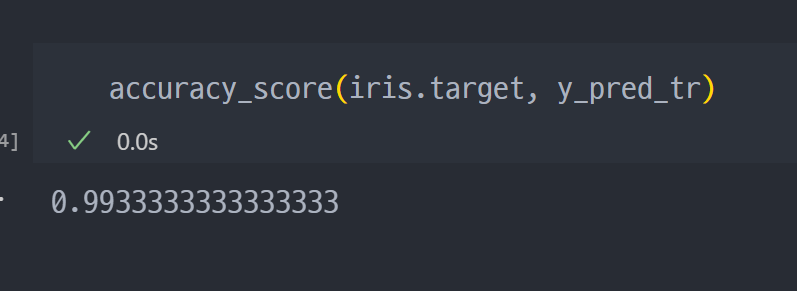- 기존 정답 (iris.target) 과 학습으로 도출한 predict 값(y_pred_tr) 비교