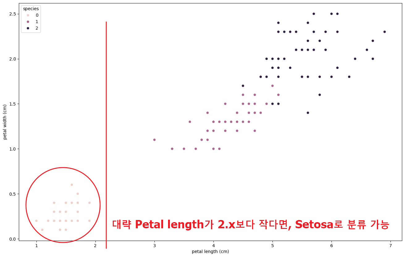 petal length 에 대하여 기준을 마련하여 Setosa는 분류 가능하다.
