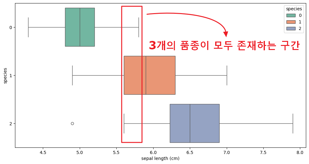 - sepal length 데이터로만은 품종( setosa, Versicolour, virginica )을 구분하기 쉽지 않다.