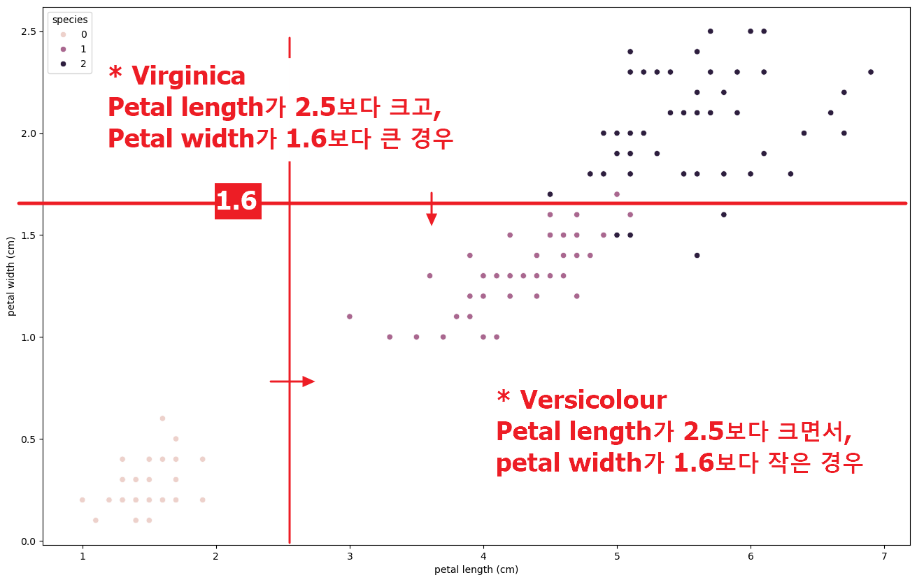 여기서, Petal length 2.5 기준은 너무나 명확하여 이견이 없을 수 있지만, Petal width 1.6이라는 기준은 임의로 진행한 거지 명확한, 구체적인 근거가 부족하다.