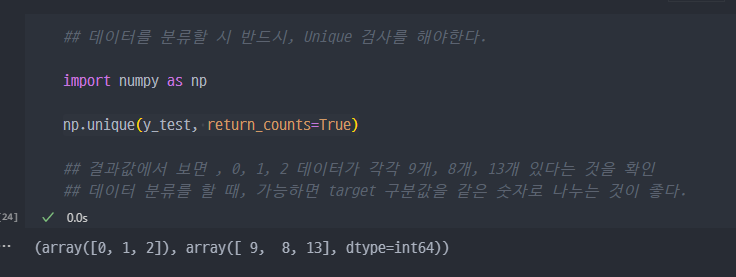 - 데이터 분할 시, class가 동일한 비율로 분할되는 것이 좋다.