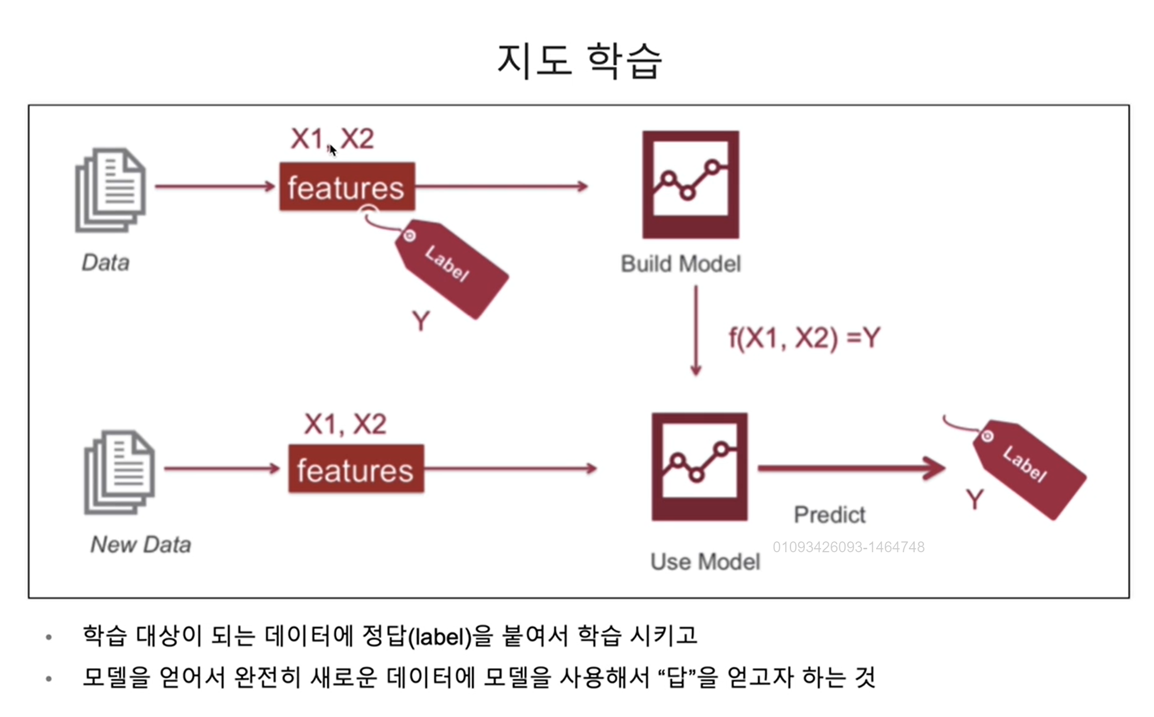 - 정답(label)을 통해서 모델을 만드는 과정을 학습 이라고 함.