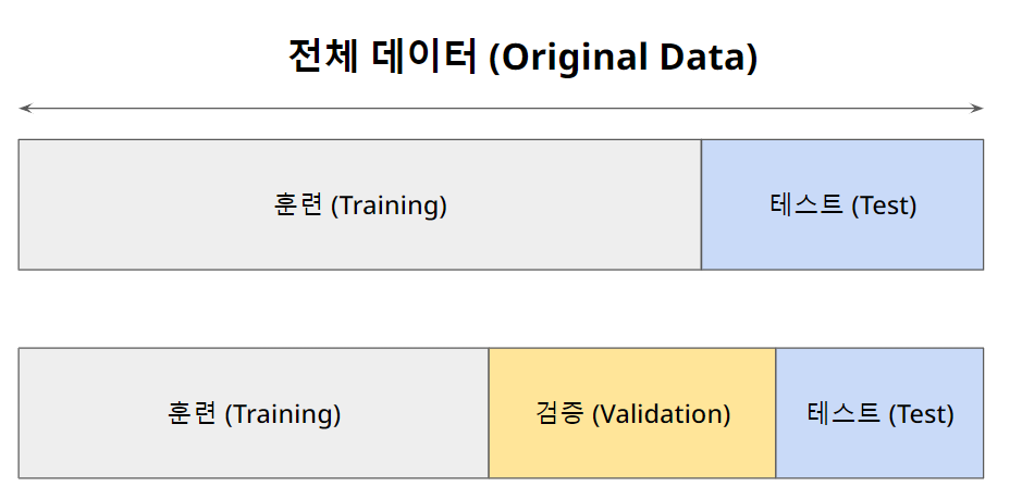 - 또, 더 나아가면, 훈련/학습을 위한 데이터, 검증을 위한 데이터, 테스트를 위한 데이터를 나누는 것이 훨씬 좋은 상황이다.