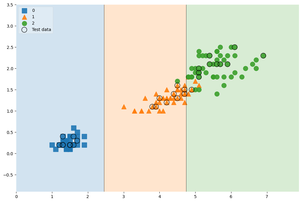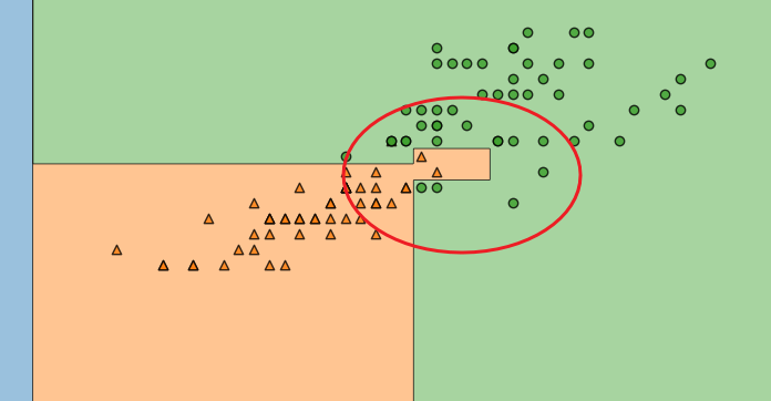 - 해당 데이터에서 보듯이, 복잡한 경계면 (구분하는 선)으로 인해서 수많은 조건문(위 Tree Model 참조)이 탄생하고, Accuracy가 높게 나온것 이다.