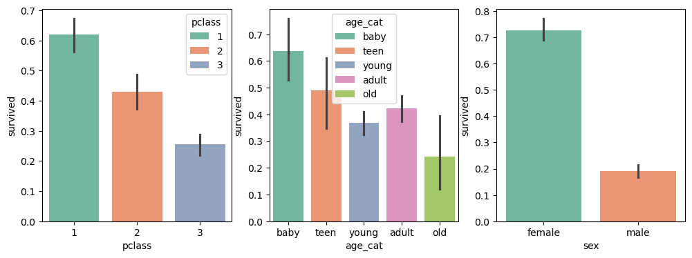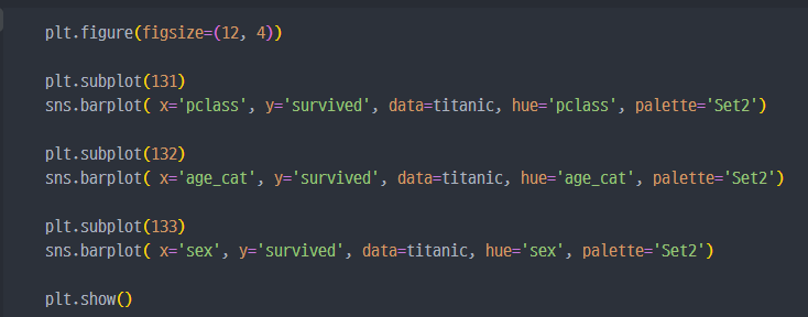 - subplot과 barplot활용하여, 클래스별, 나이별, 성별 생존률 나타내기.