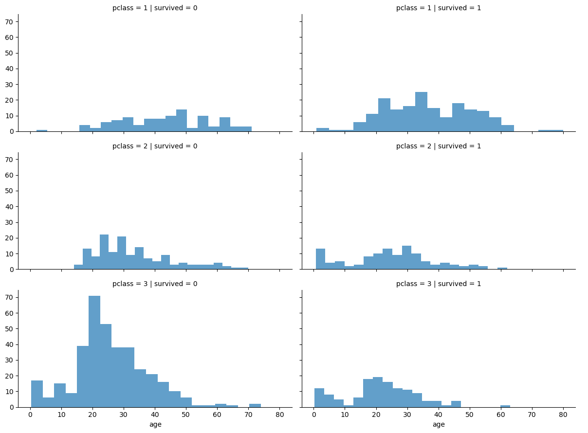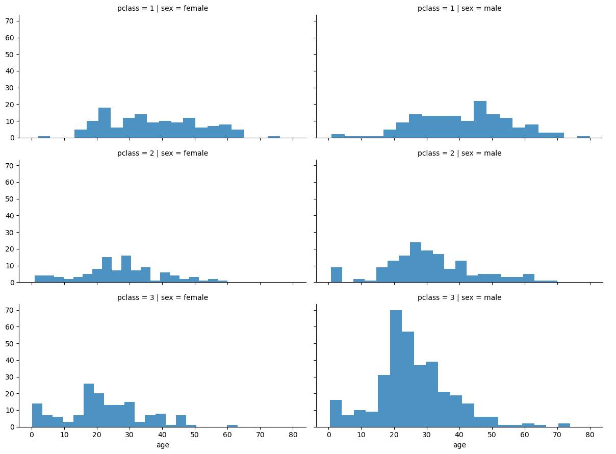 - 남여 나누고, pclass(탑승 등급)별로 나누고, 나이에 대하여 히스토그램으로 그래프 작성