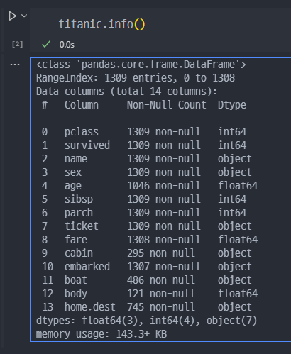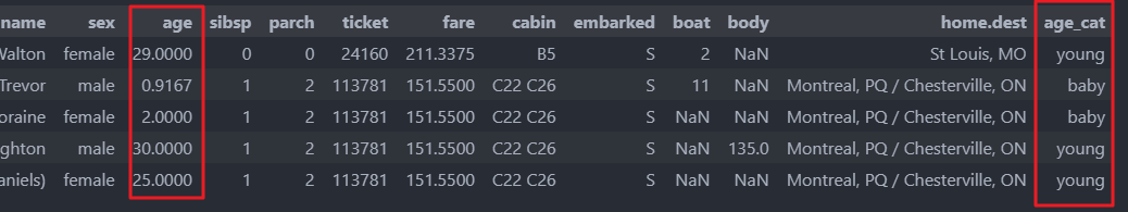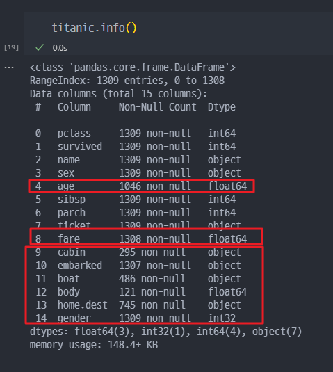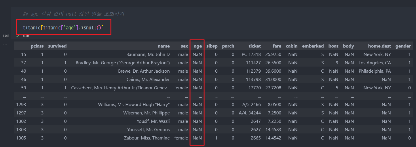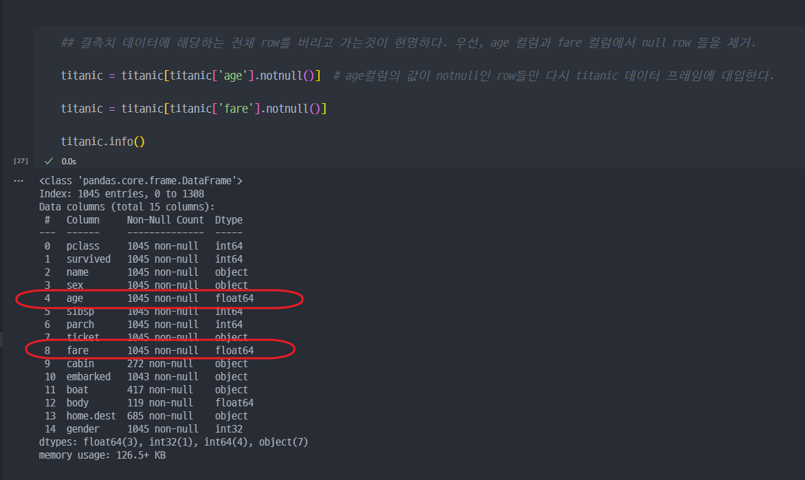- 'age' 컬럼과 'fare'컬럼에서 결측치 포함된 rows 들 제거하기