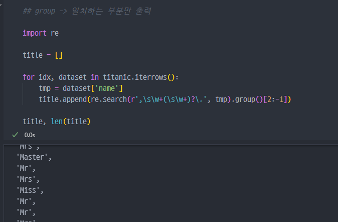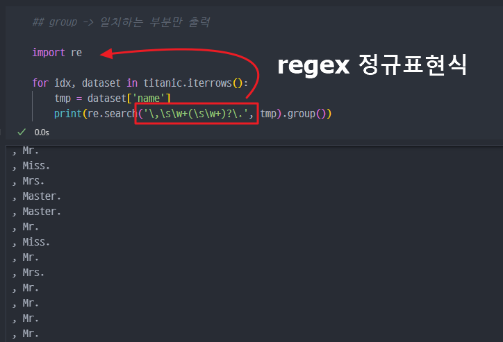 - regex (정규표현식)을 이용해서, 이름의 Mrs, Miss 등 중간 부분만 추출한다.