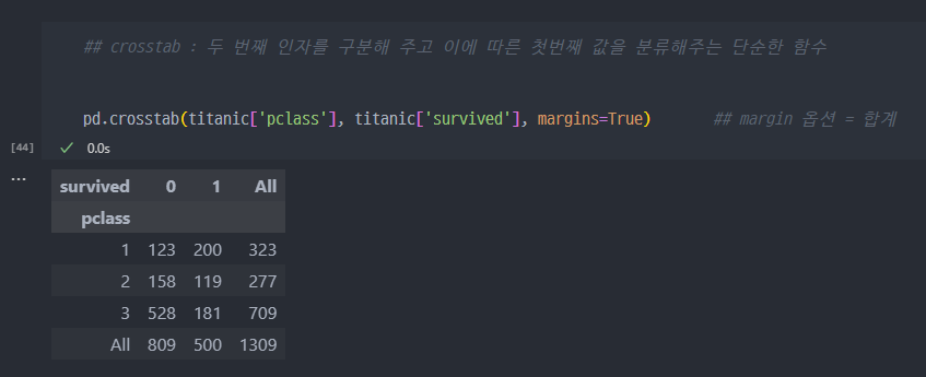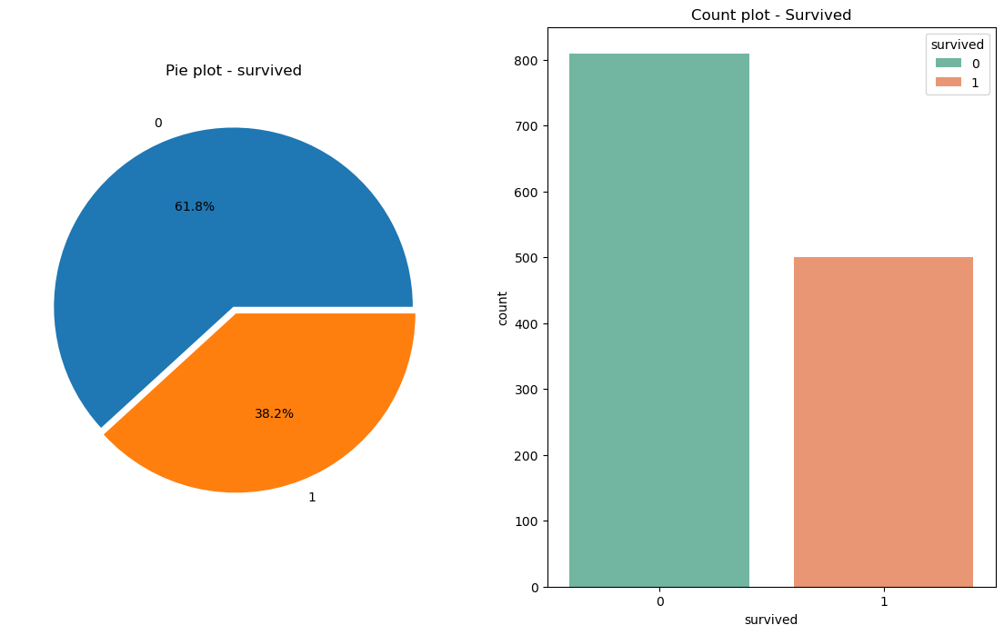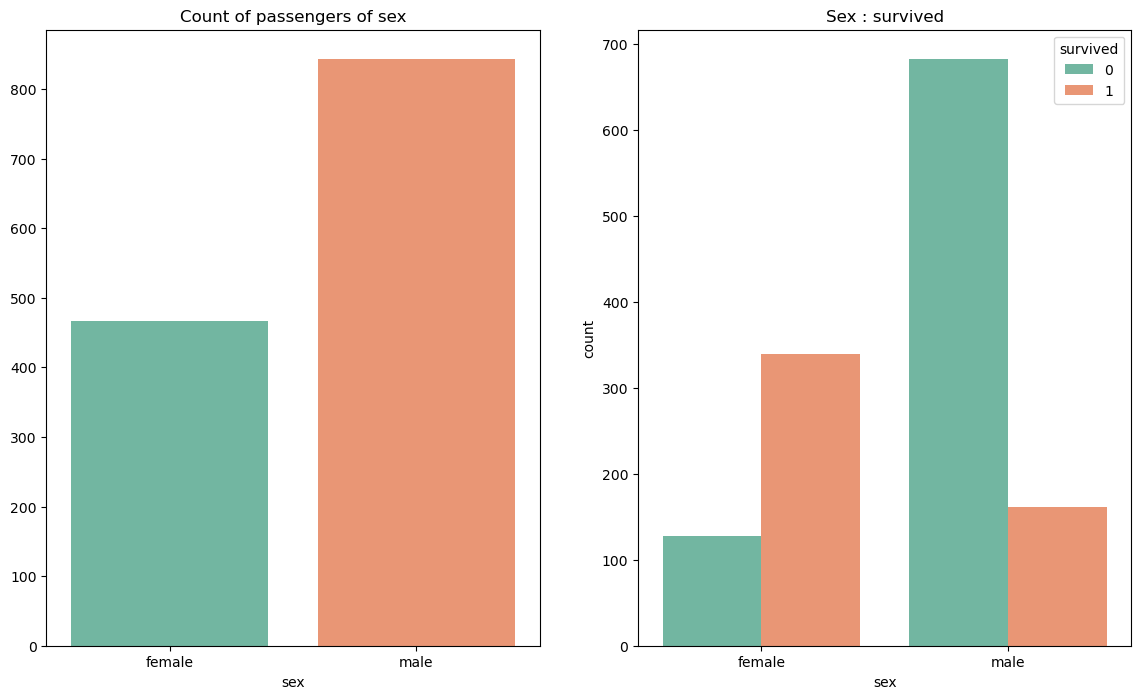 → 결과를 보면, 남자의 생존률이 더 낮다. 탑승객은 남자가 약 840명, 여자는 약 450명 탑승한 것으로 보인다. 그렇지만, 생존자 수는 여성이 더 많다.