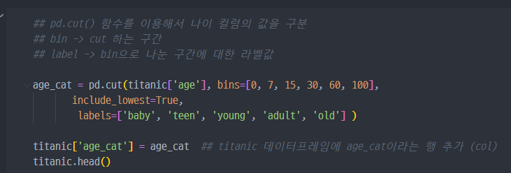 나이의 범위가 너무 많으니, pandas의 cut 함수를 이용해서 구분 진행.