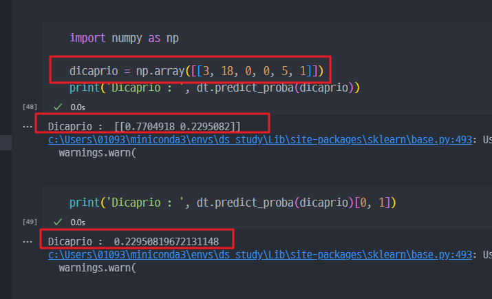 - 디카프리오 데이터를 대입하여 생존률 예측