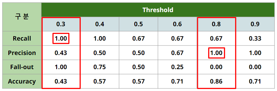 실제 양성인 데이터를 음성이라고 판단하면 안되는 경우라면, Recall이 중요하고, 이 경우는 Threshold를 0.3 또는 0.4로 선정해야 함 (eg. 암환자 판별)
