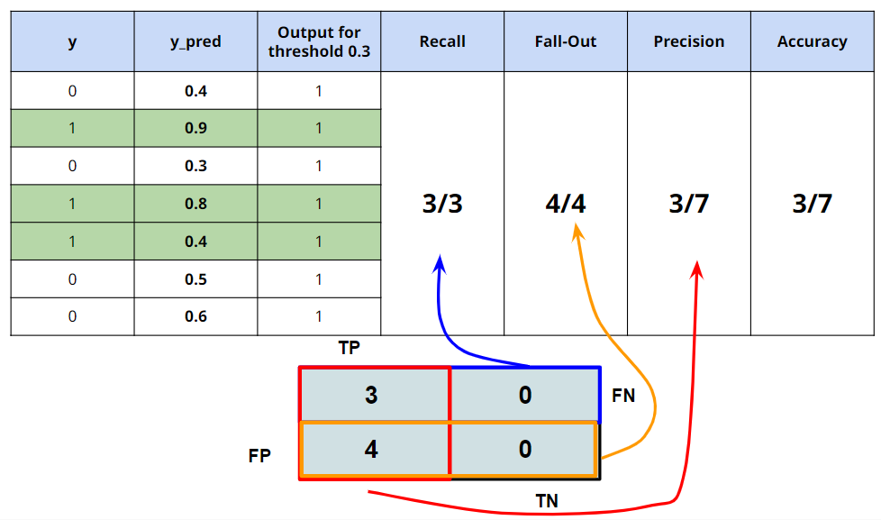 Threshold 가 0.3 이며, y_pred의 모든 값이 0.3 이상이므로, 1으로 예측.