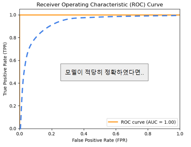 높은 TPR과 낮은 FPR을 의미하므로, 많은 긍정 사례를 정확히 예측하면서도 거짓 긍정을 최소화함.