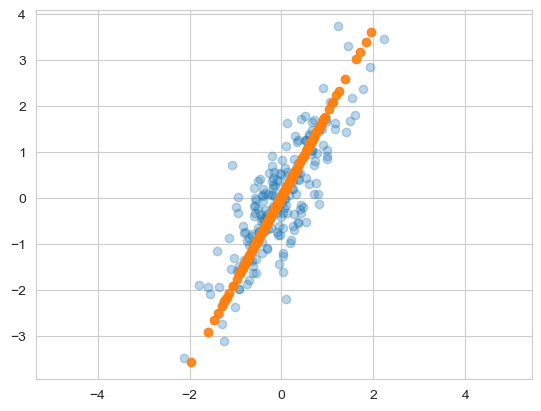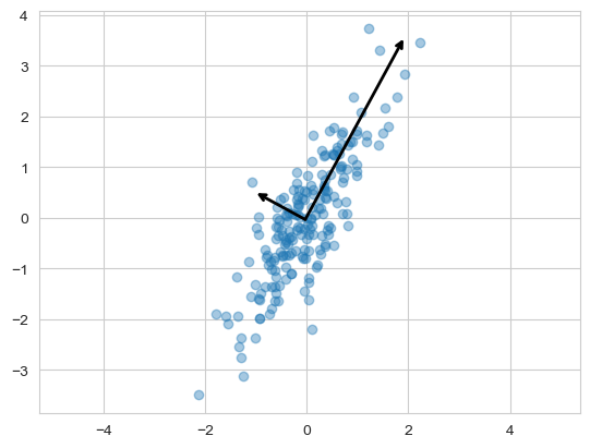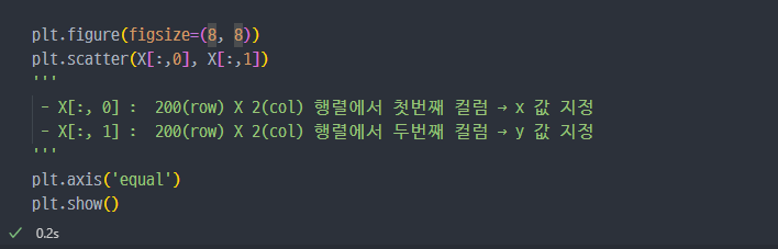 rng.rand(2, 2) : [0, 1) 범위에서 균일 분포로 랜덤 숫자를 생성하여 2×2 행렬을 만듭니다.[0, 1) = 0 이상이고 1 미만rng.randn(2, 200) : 평균 0, 표준편차 1인 정규분포를 따르는 난수를 생성하여 2×200 행렬을 만듭니다.np.dot(rng.rand(2, 2), rng.randn(2, 200)) : np.dot(A, B)는 두 행렬 A와 B의 행렬 곱을 수행합니다. 여기서는 2×2 행렬과 2×200 행렬의 곱이므로 결과는 2×200 행렬입니다..T : 결과 행렬을 전치(transpose)합니다. 즉, 2×200 행렬이 200×2 행렬로 바뀝니다.위 생성된 행렬에 대해서,