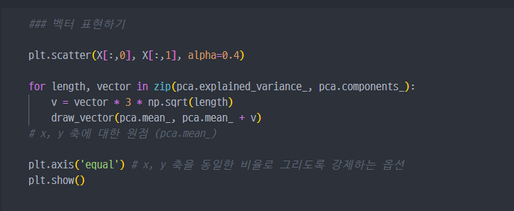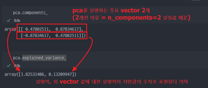 고유값과 고유벡터 계산 : 공분산 행렬의 고유값과 고유벡터를 계산합니다. 고유값은 주성분의 중요도를 나타내고, 고유벡터는 주성분의 방향을 나타냅니다.