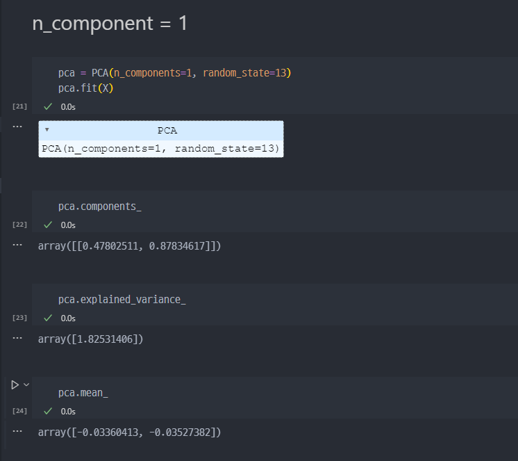 기존 X데이터와 X_new (pca에 의해서 수정된 데이터, n_components=1 옵션) 데이터를 비교하면 위 그래프와 같다. 기존 X 데이터를 pca과정을 지나, 위와 같이 직선의 형태를 띄는 데이터로 변경(수정)된 것이다.