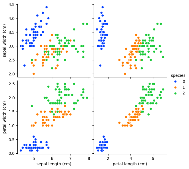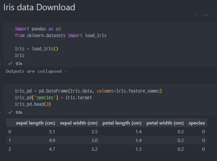 sklearn 의 Datasets에 저장된 iris 데이터를 불러온다.Pandas 의 DataFrame 형태로 변경