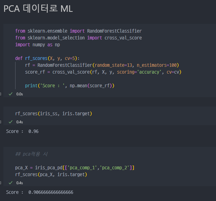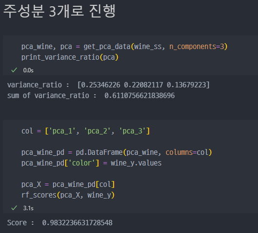 주성분이 2개일 때와rf_score값은 큰 차이 없어보인다.variance_ratio는 조금 상승하였다.