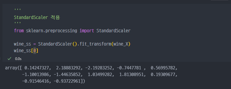데이터값을 보면, 0.7 단위부터 34 까지 각 feature별로 다양하므로 PCA 적용을 위해 먼저 StandardScaler 적용