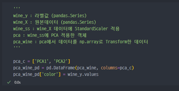 pca한 데이터를pandas의 DataFrame 형태로 변경. (라벨값 포함)