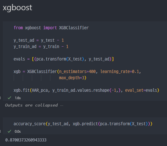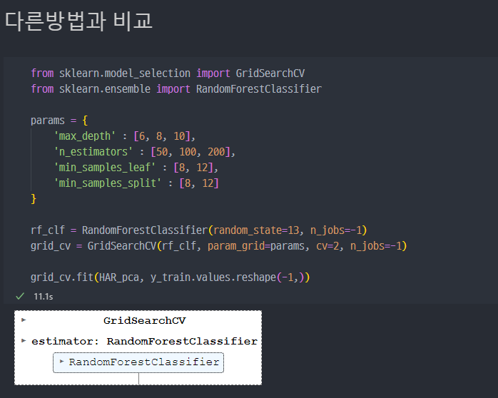 n_estimators를 200으로하고,max_depth를 10으로 했을 때 가장 좋은 성능이며, 약83%정도이다.PCA에서n_components를 10으로하고 계산한 결과와 유사하다. 다만 시간은 훨씬 더 걸린다.