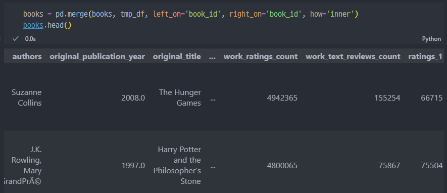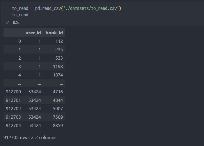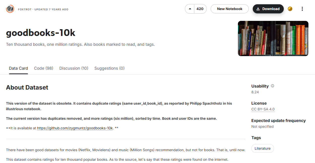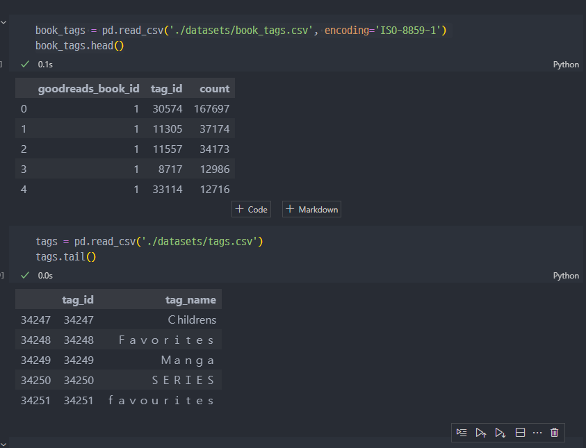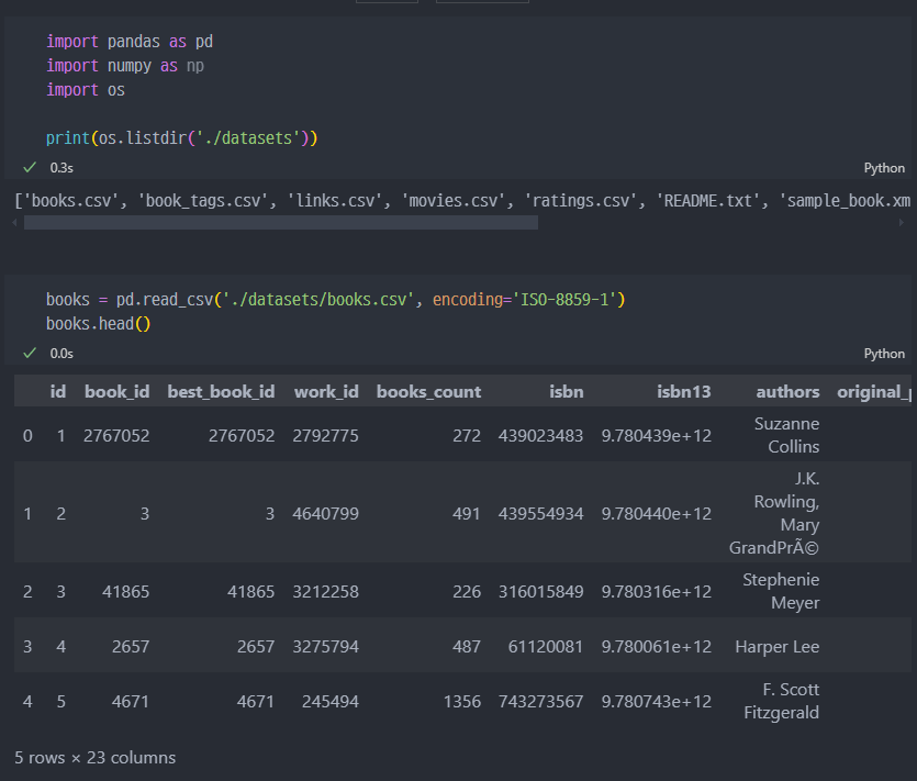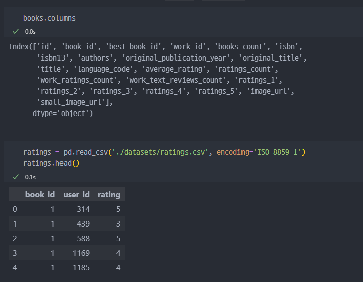 kaggle을 통해서 데이터 load 진행- books.csv 파일과 ratings.csv 파일, bokk_tag.csv 등