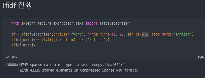 analyzer : 텍스트를 분석할 단위를 설정합니다. 기본값은 'word'로 단어 단위로 분석합니다.ngram_range : n-gram의 범위를 지정합니다. 예를 들어, (1, 2)는 1-gram(단어)과 2-gram(두 단어의 조합) 모두를 사용합니다.min_df : 문서에서 최소 빈도로 나타나야 하는 용어의 비율을 지정합니다. 여기서는 0.0으로 설정하여 모든 용어를 포함합니다.stop_words : 불용어를 제거합니다. 'english'로 설정하여 영어 불용어를 제거합니다.F-IDF 설명