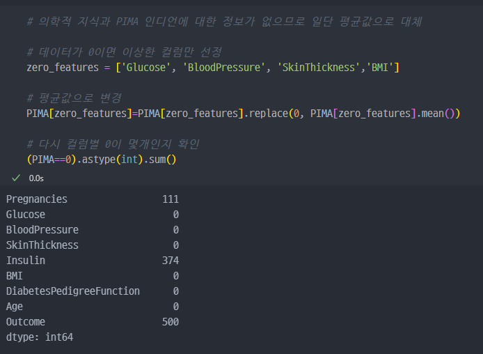 0이면 안되는 컬럼을 선정하여, 해당 컬럼의 평균값으로 대체 진행.
