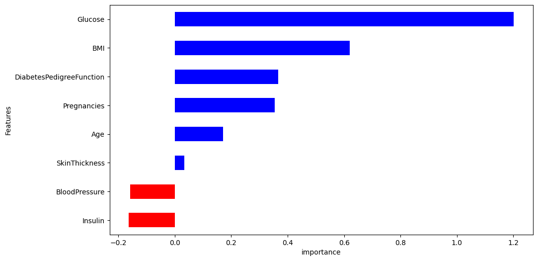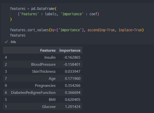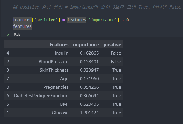 정확도는 비교적 좋은 편이지만(77.27%), 재현율이 낮아(61.11%) 실제 양성 샘플을 놓치는 경우가 많습니다.정밀도(70.21%)는 양성을 예측했을 때 신뢰할 수 있는 수준이며, 이는 모델이 양성을 잘 예측하고 있음을 나타냅니다.AUC 점수(73.56%)는 양성과 음성을 잘 구분하고 있음을 보여주지만, F1 점수(65.35%)는 성능이 여전히 개선될 여지가 있음을 시사합니다.4. 중요한 Features 그래프 작성
