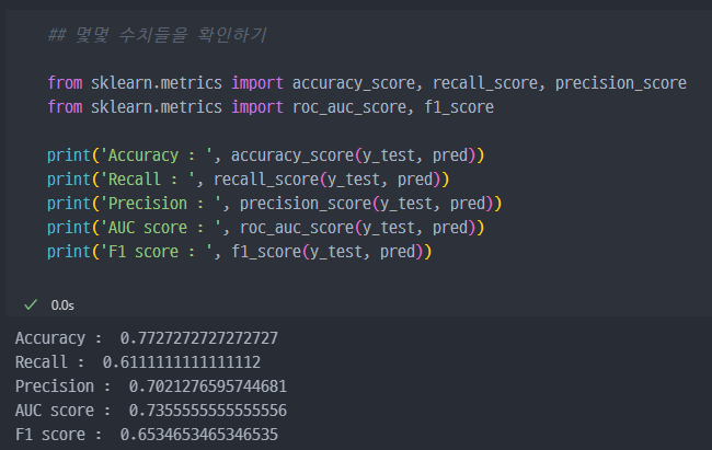 값: 0.7727 (약 77.27%)해석: 전체 샘플 중에서 올바르게 분류된 샘플의 비율입니다. 즉, 77.27%의 샘플이 모델에 의해 정확하게 예측되었습니다. 그러나 정확도는 클래스 불균형이 있는 경우 해석에 주의가 필요합니다.2. Recall (재현율)
