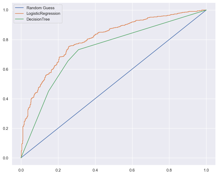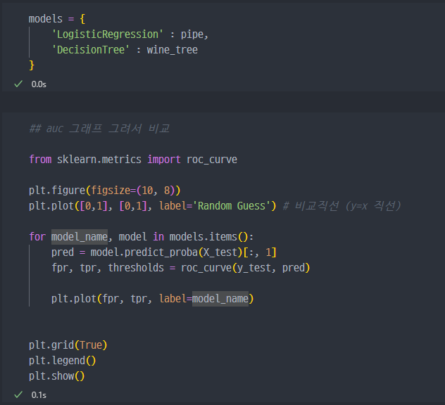 roc 커브 그래프를 통한 비교 진행roc 커브에서 해당 곡선과 x축 사이 공간의 면적이 auc라 불리며, 이 값이 1에 가까울 수록 성능이 좋다.Logistic Regression이 Decision Tree 곡선보다 더 위에 있으니, 성능이 더 좋은 모델이라 할 수 있다.이전 강의 내용 참조 ML #7