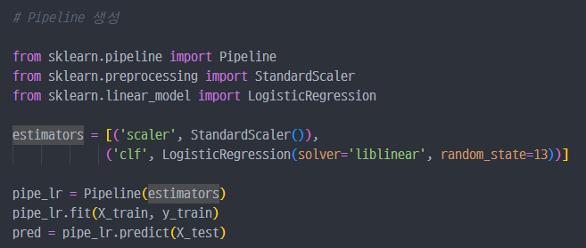 ('scaler', StandardScaler()) : 데이터를 표준화하는 단계입니다.('clf', LogisticRegression(...)) : 로지스틱 회귀 분류기를 정의합니다. solver='liblinear'는 작은 데이터셋에 적합한 최적화 알고리즘을 사용하도록 설정하고, random_state=13은 결과의 재현성을 위해 난수 시드를 설정합니다.pipe_lr : 정의된 estimators를 사용하여 파이프라인 객체를 생성합니다. 이 객체는 데이터 전처리와 모델 학습을 순차적으로 수행합니다.