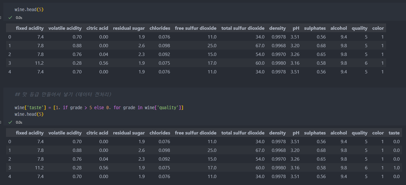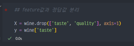 quality를 통해taste정답값을 생성했으므로, 반드시quality컬럼은 drop해야 한다.