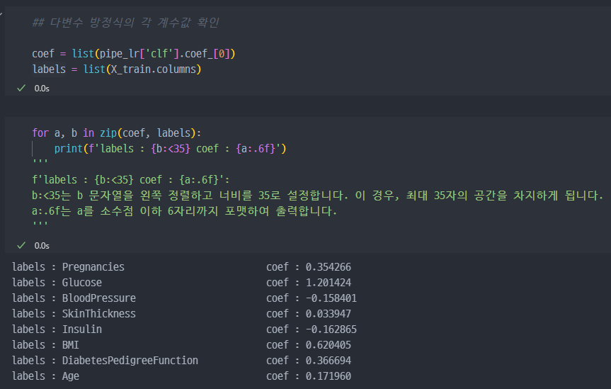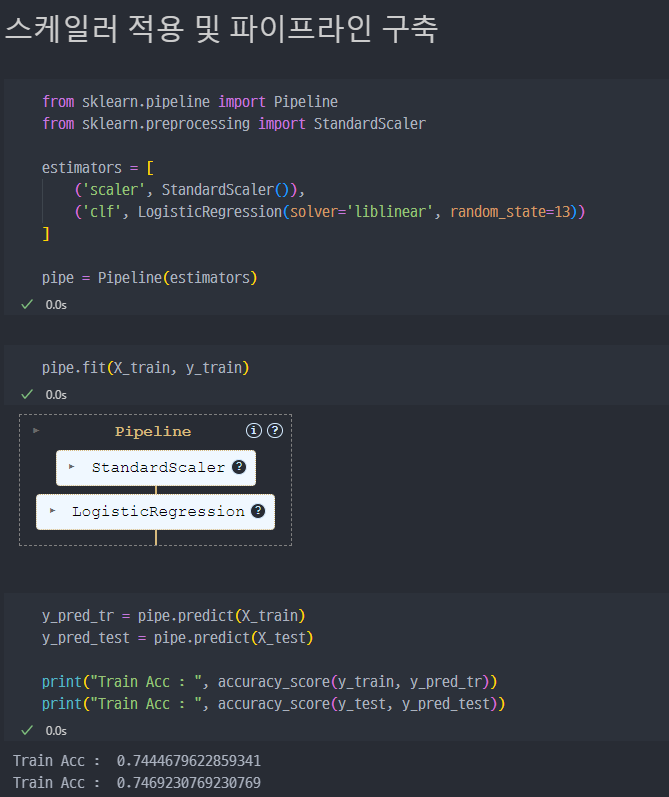 fit : 훈련 데이터 X_train과 레이블 y_train을 사용하여 파이프라인을 학습합니다. 이 단계에서 StandardScaler가 먼저 호출되어 데이터를 표준화하고, 그 결과가 LogisticRegression 모델에 전달되어 학습됩니다.