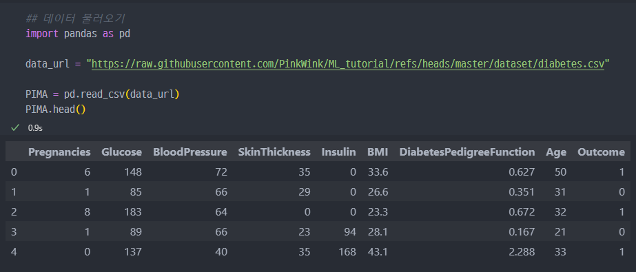 github에 저장되어 있는 데이터 불러오기 진행PIMA = PIMA.astype('float')