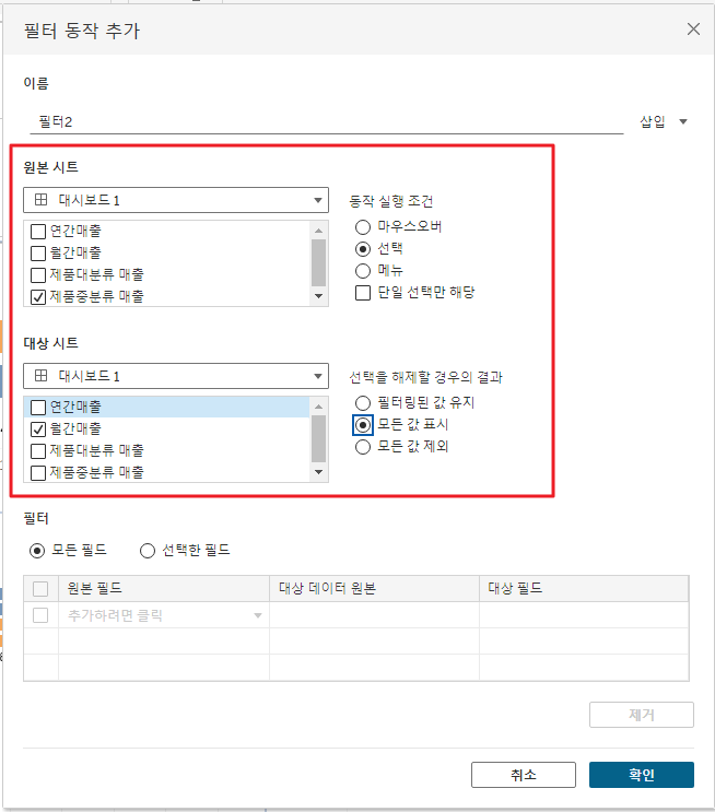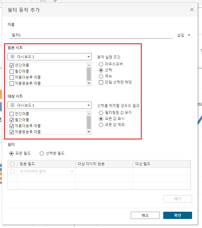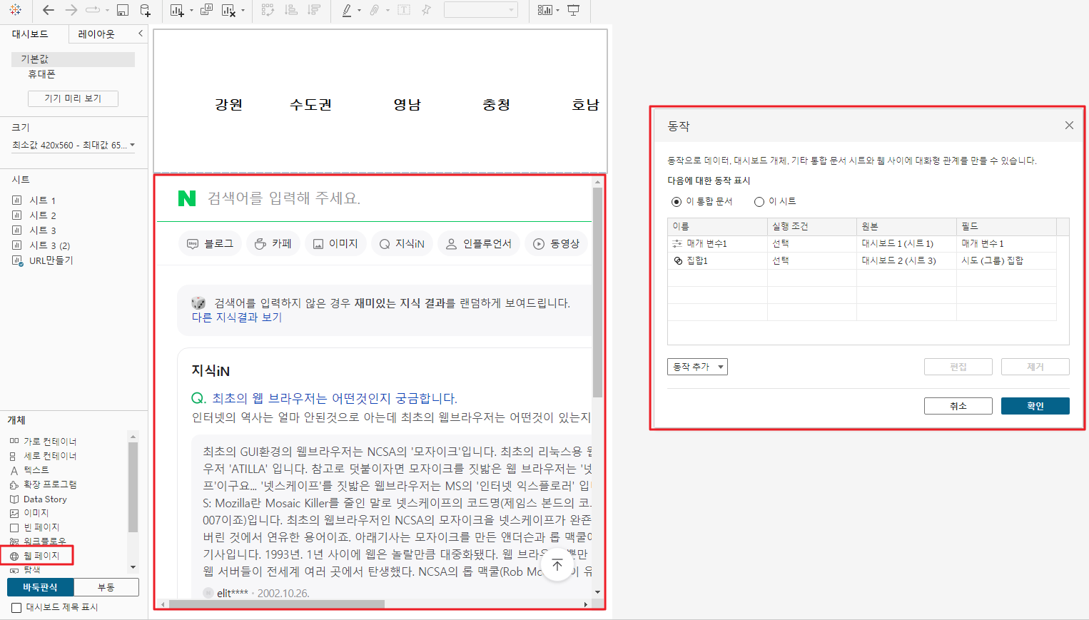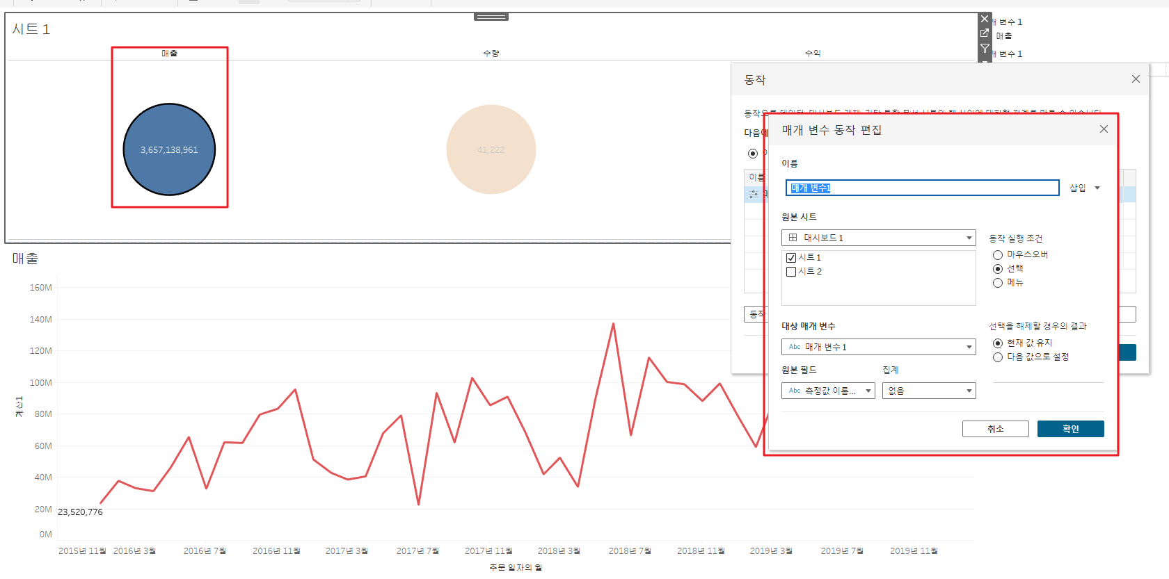 - 최종적으로 대시보드 - 동작에서 매개변수 할당을 설정하게 되면, 시트1과 시트2가 연결되며 대시보드에서 동작된다.