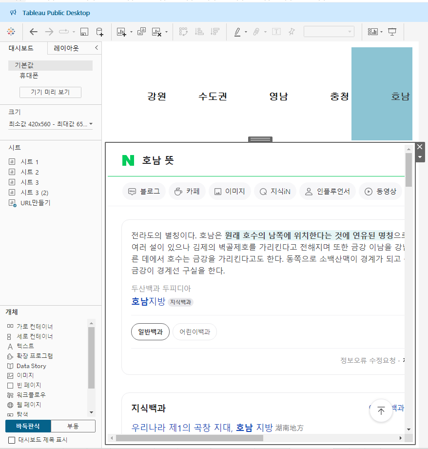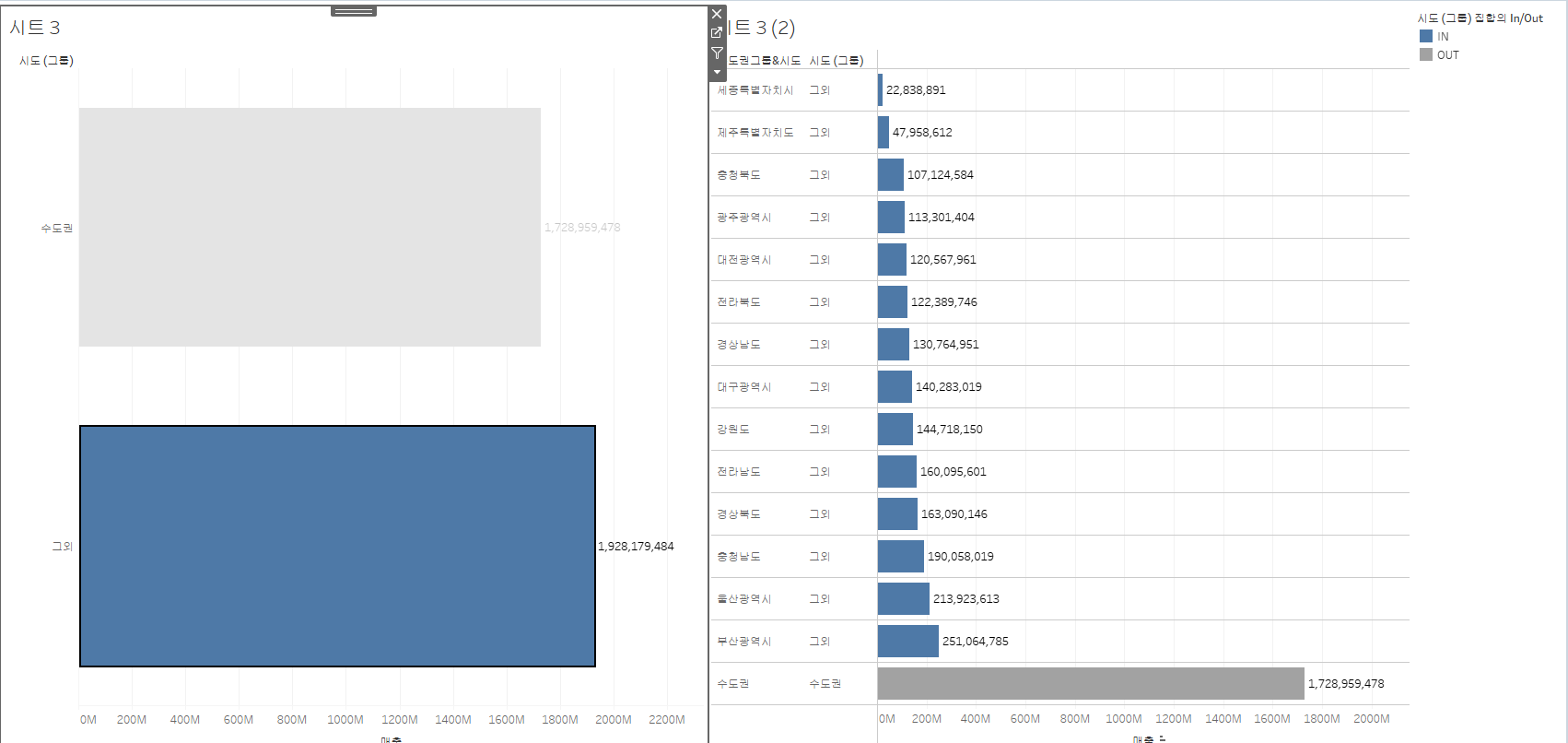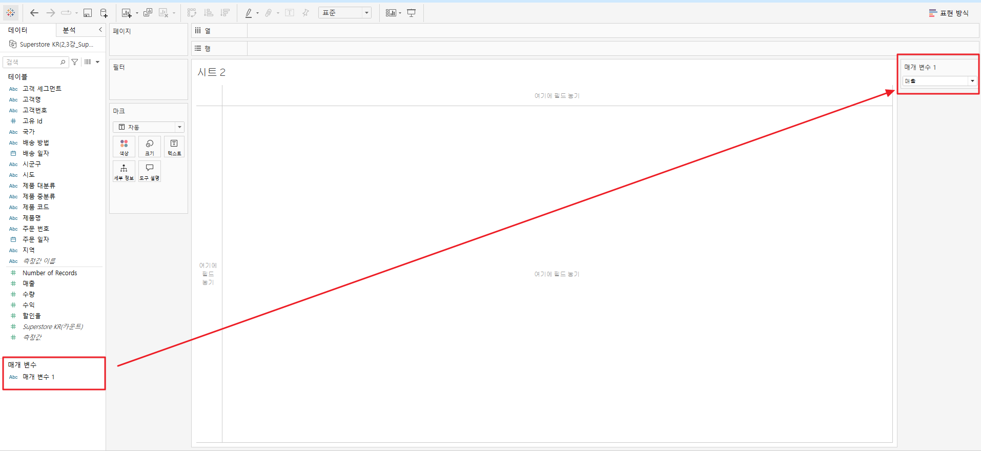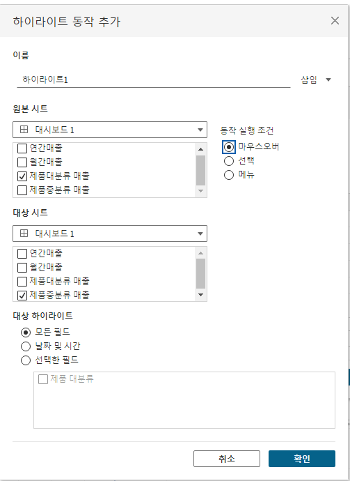 - 최종적으로 대시보드 - 동작에서 매개변수 할당을 설정하게 되면, 시트1과 시트2가 연결되며 대시보드에서 동작된다.