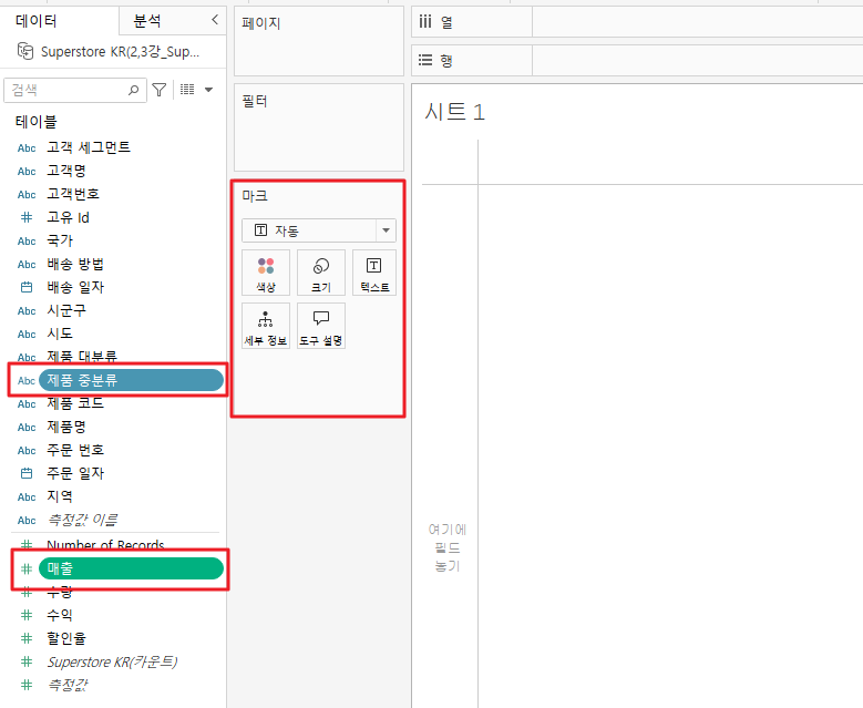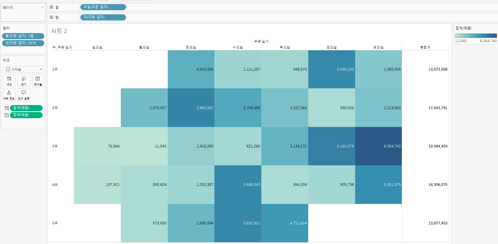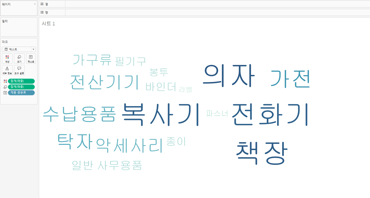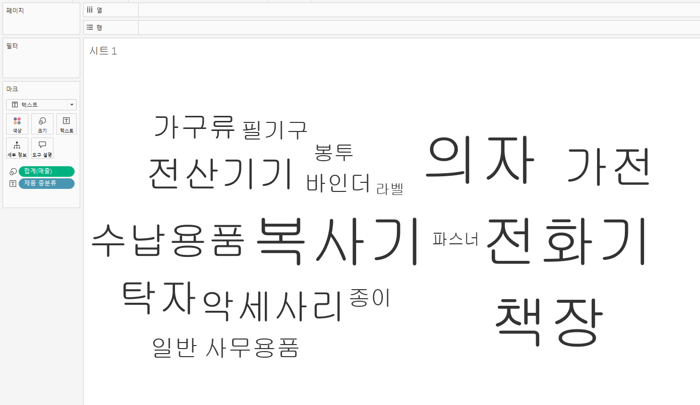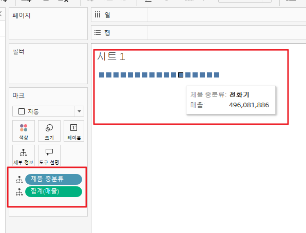 - 매출을 크기에 대입. 이후 트리맵형태로 출력되면 마크카드에서 텍스트로 변경 →