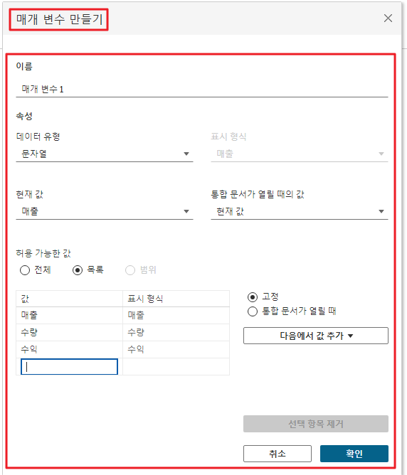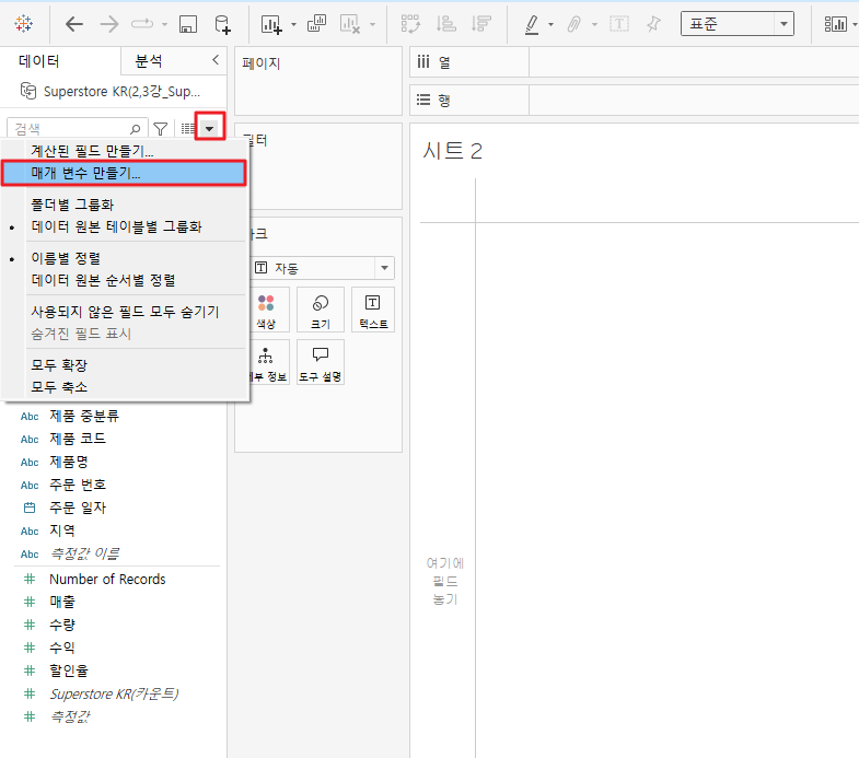 - 매개변수 설정하게 되면 좌측 사이드바에 매개변수가 생성되며, 우클릭 후 옵션에서 보기 선택하면 우측에 드롭다운 메뉴 생성