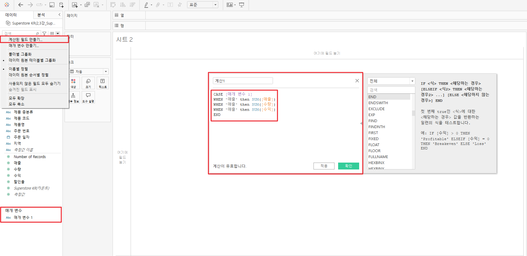 - 좌측 계산된 필드 만들기에서, 매개변수에 대한 수식 할당