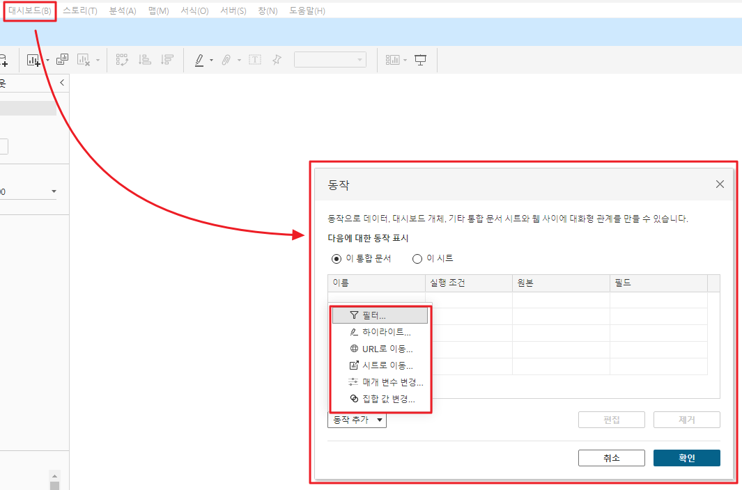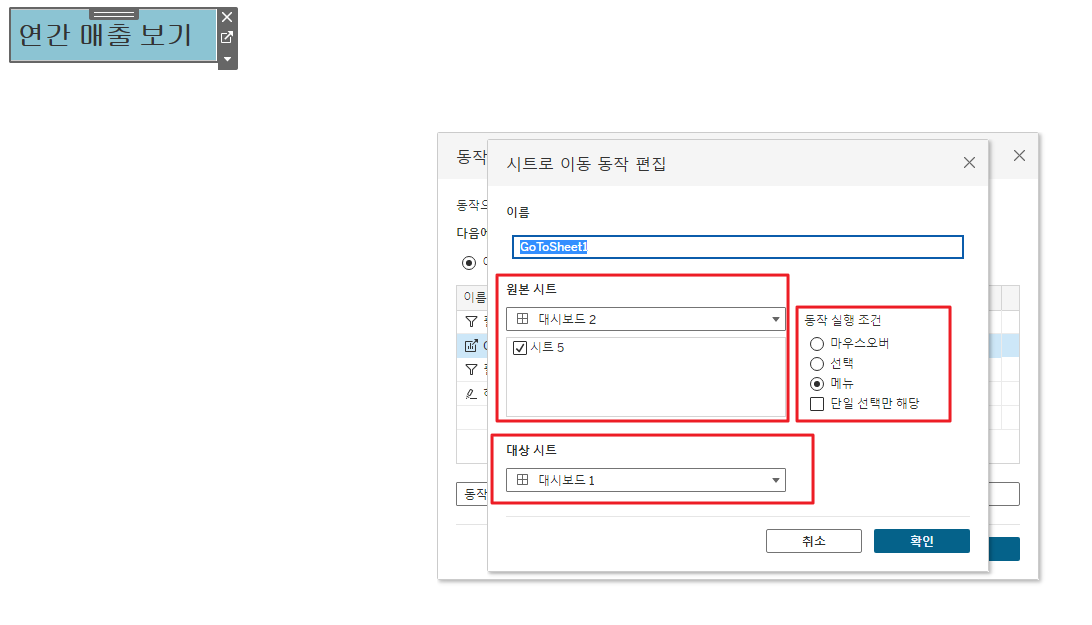 - 대시보드 - 동작에서 시트로 이동 동작을 추가하여 선택 시