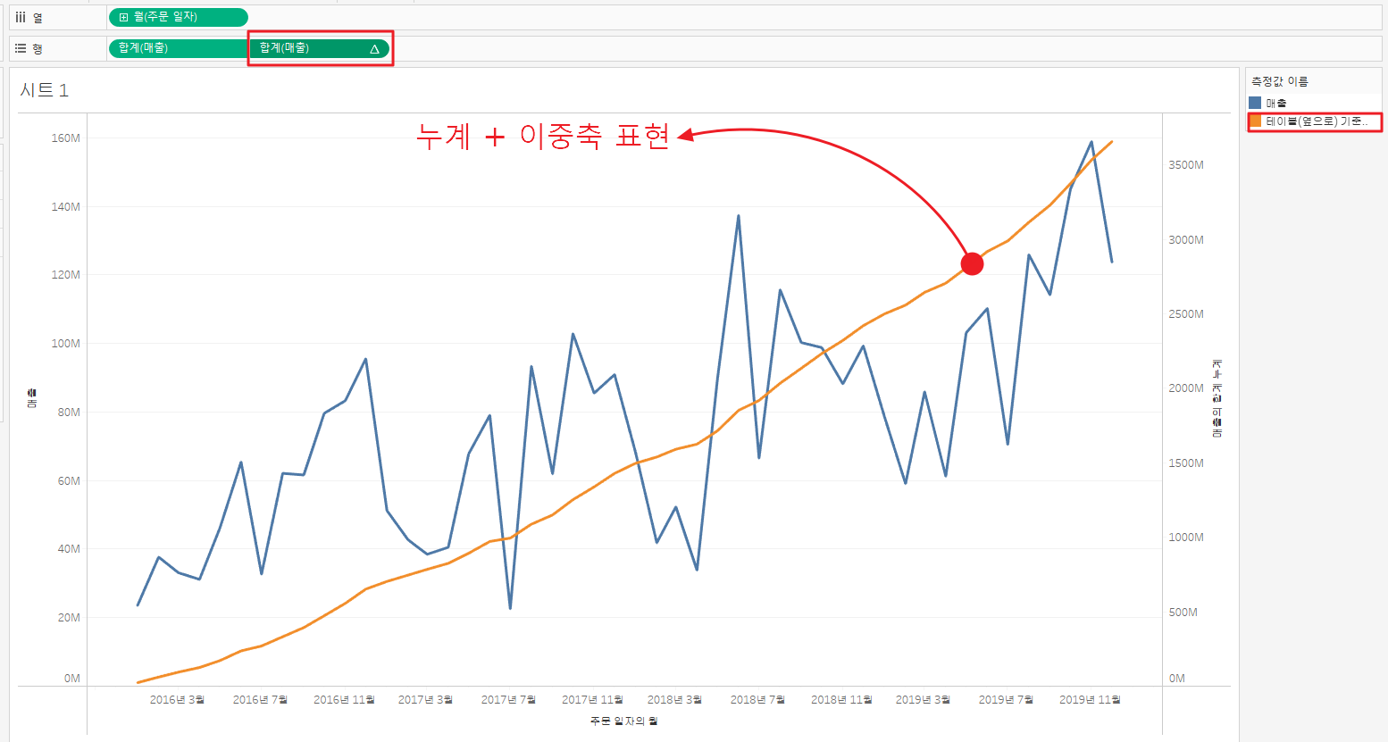 - 월간 매출 (연속형) 값과 지속되는 누계 비교