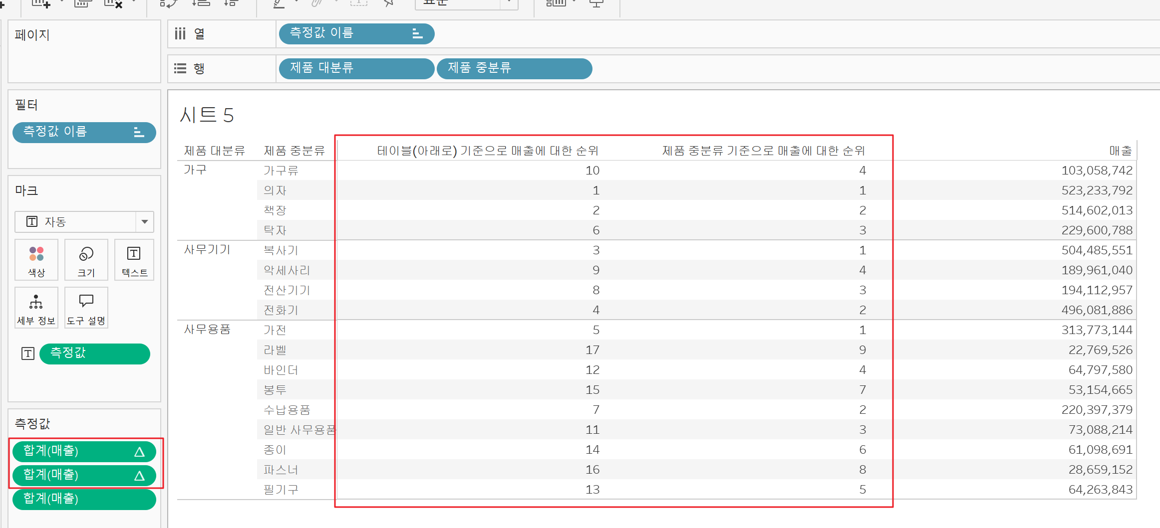 - 각 항목별 순위 혹은 대분류 내 중분류의 순위표현