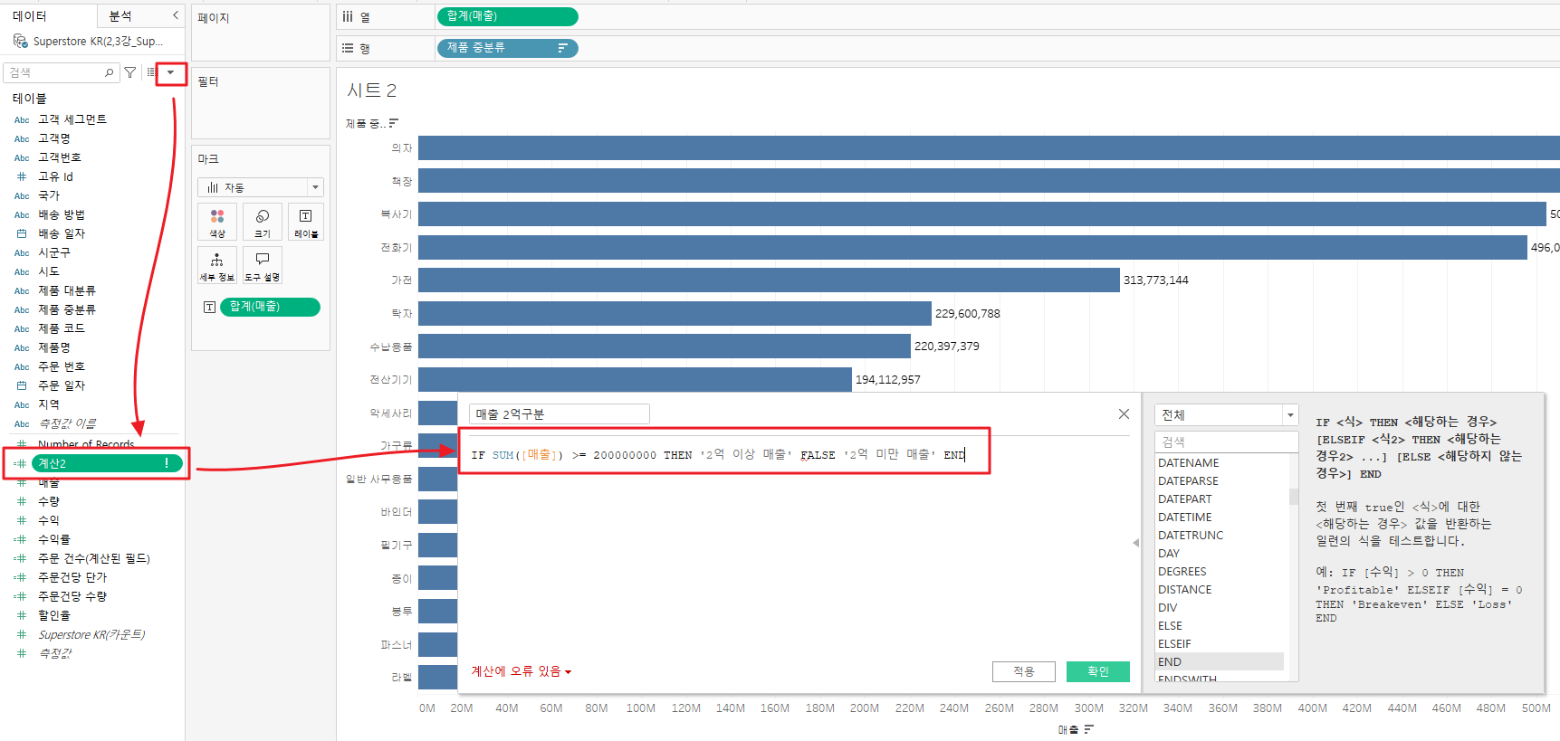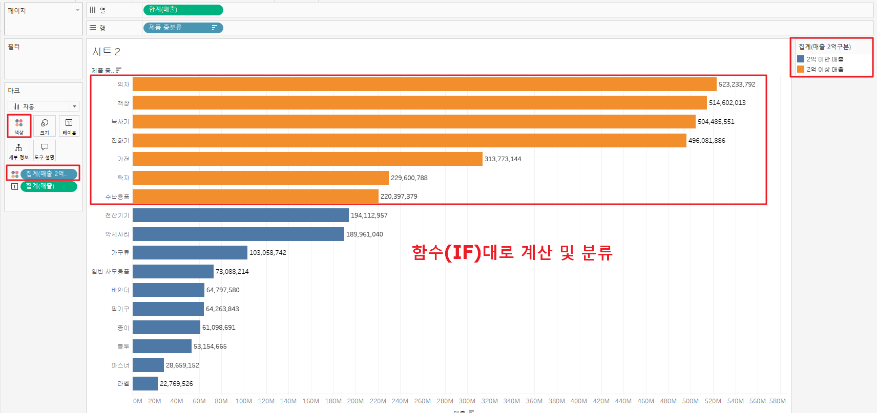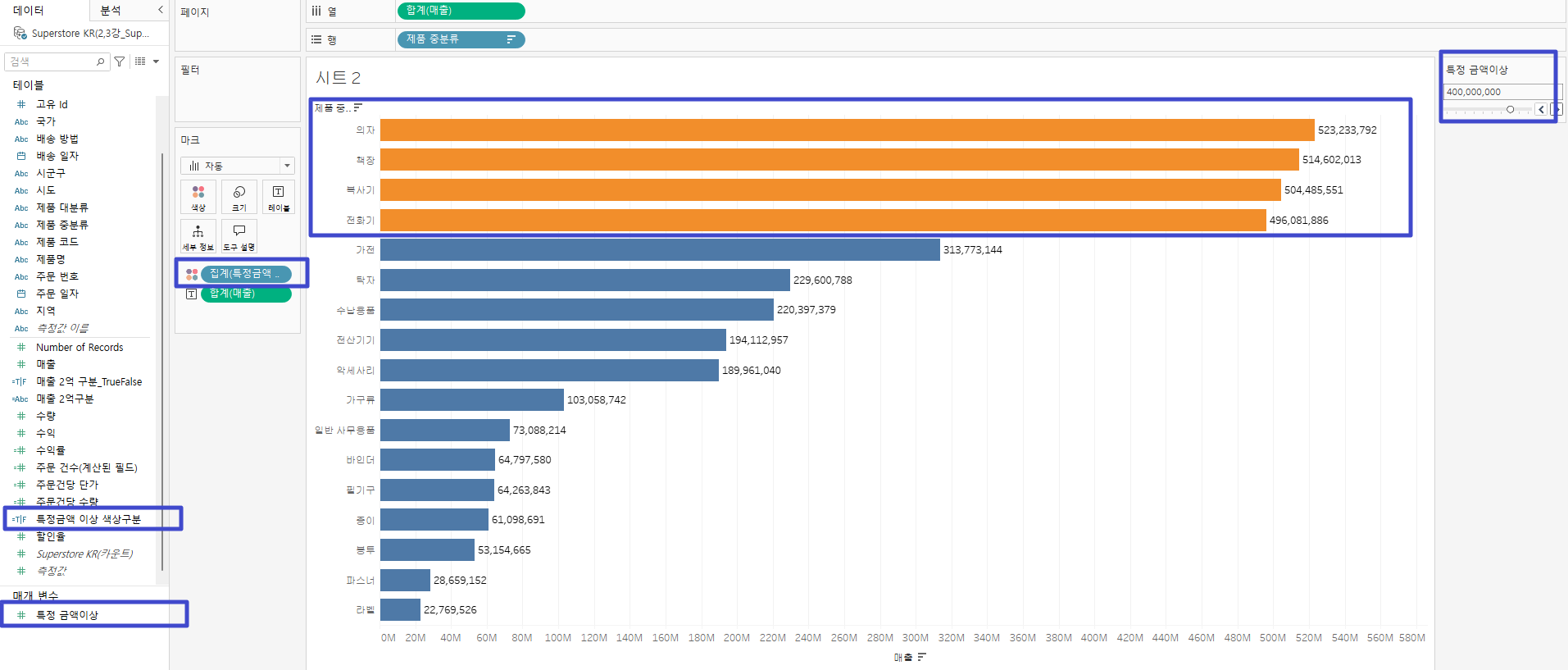매개변수와계산된 필드를 활용해서 매개변수 값에 따라서 매출의 색상이 변경되는 효과 생성