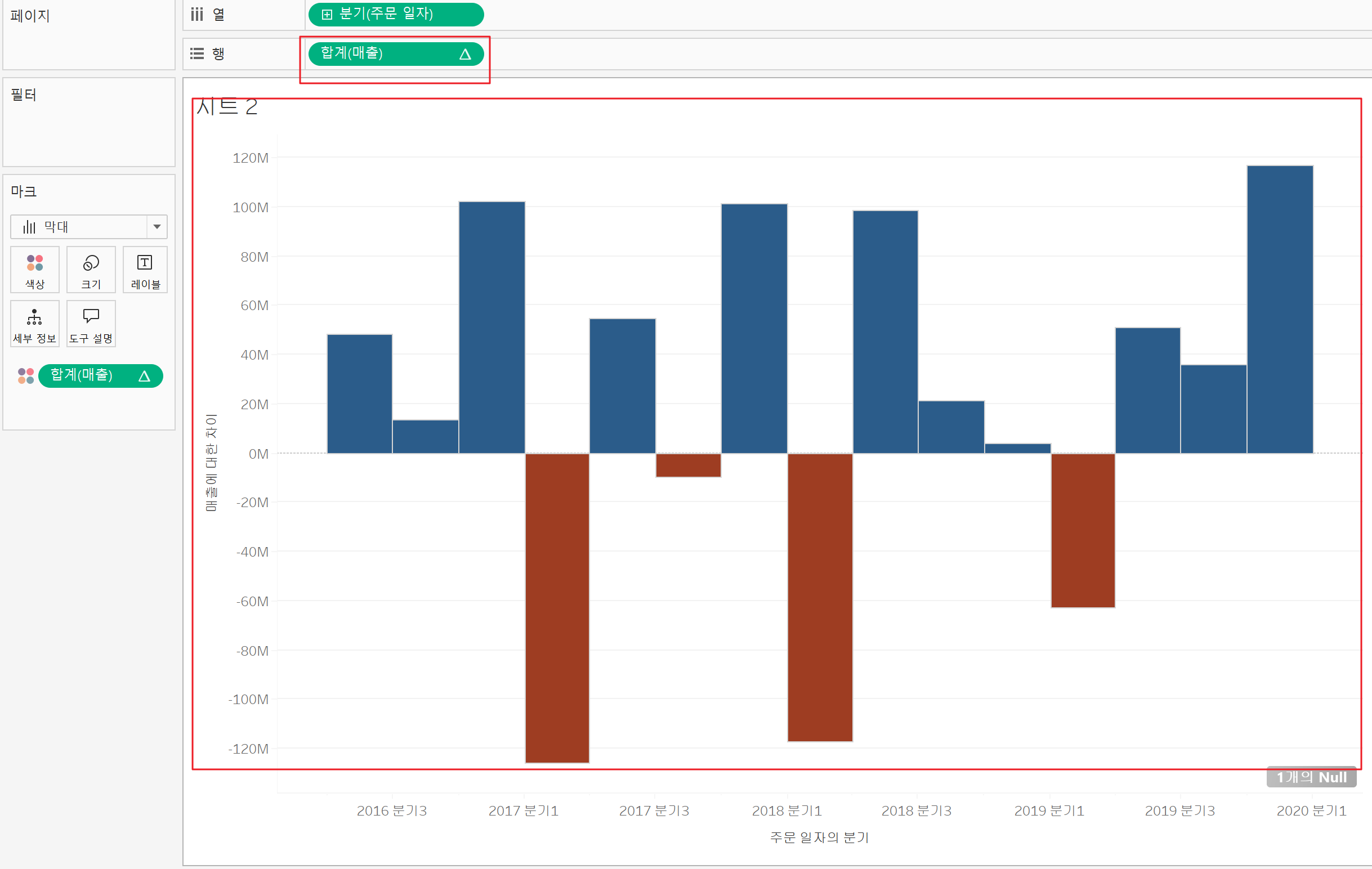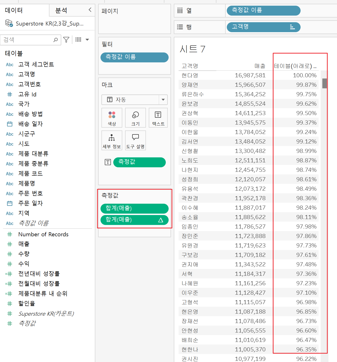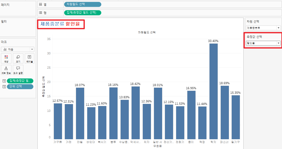 매개변수와계산된 필드를 활용해서 매개변수 값에 따라서 매출의 색상이 변경되는 효과 생성