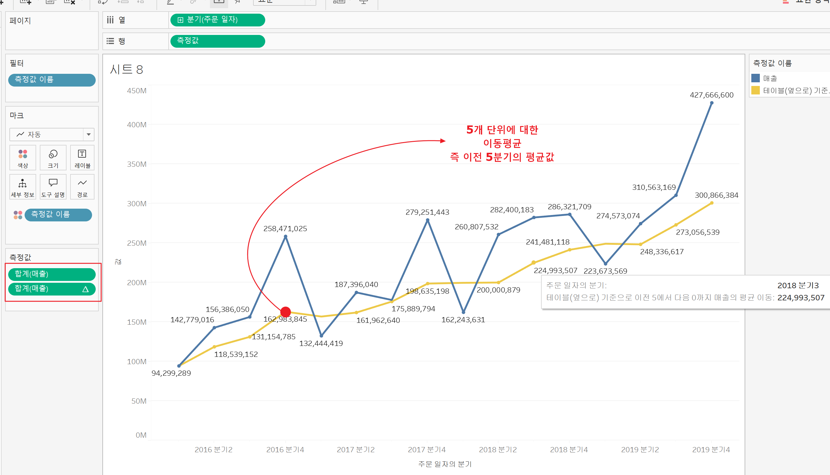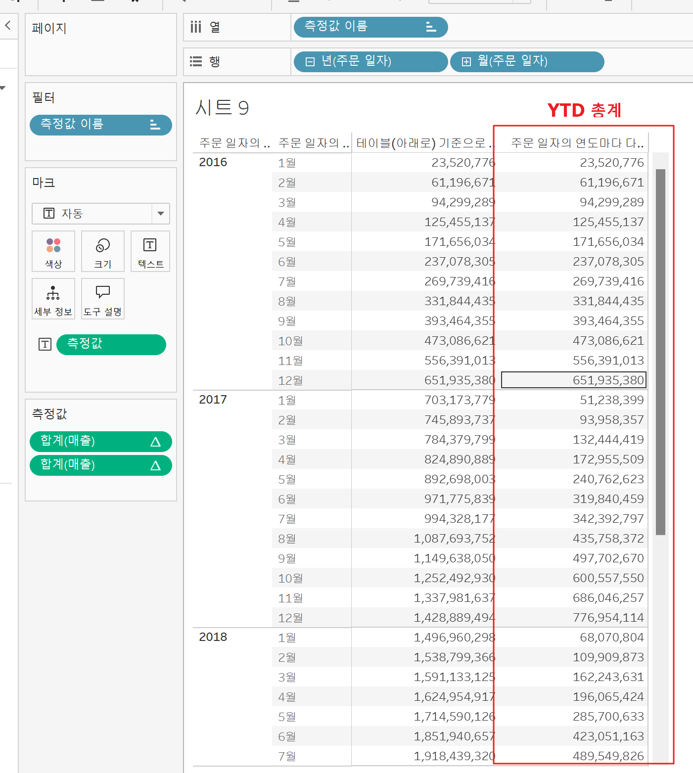 - YTD 총계는 누계와 유사하다. 다만, 년도를 기준으로 누계를 분리한다. 즉, 누계와 큰 차이 없다.