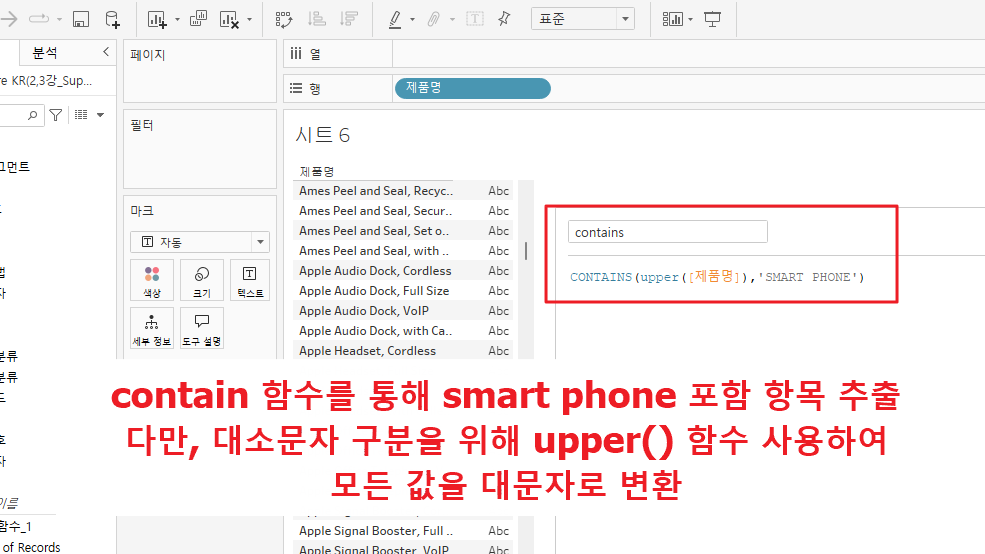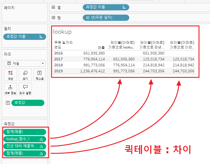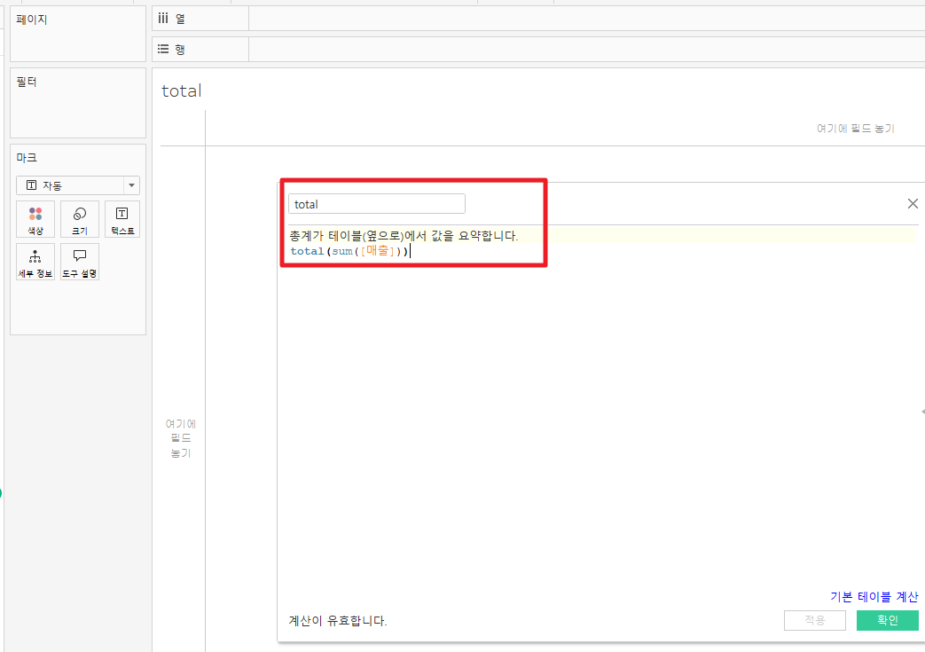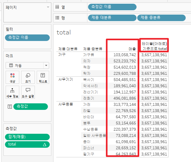 - SUM(합계) 함수는 차원에 따라 그 차원(필드)에 맞는 합계값을 산출해 주지만,