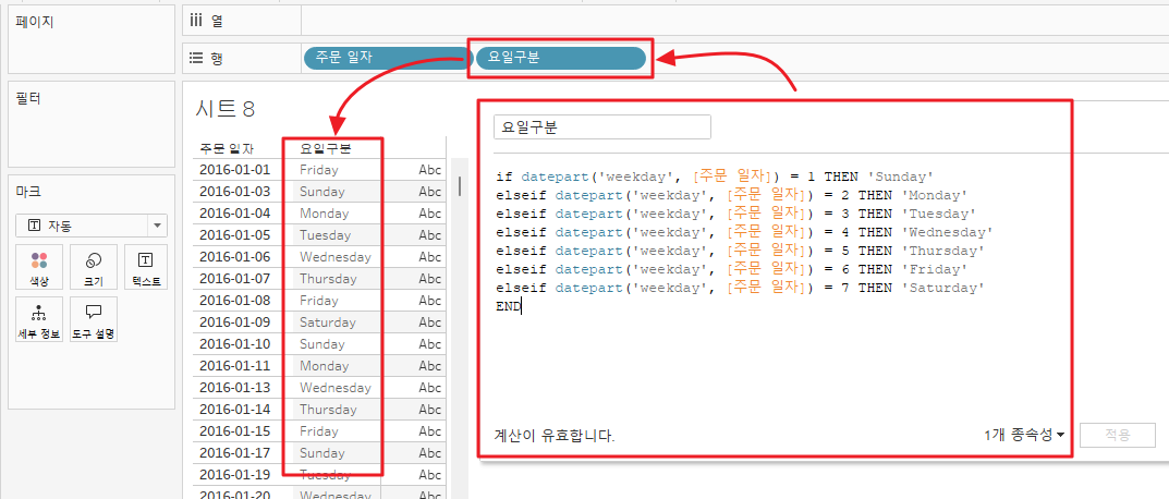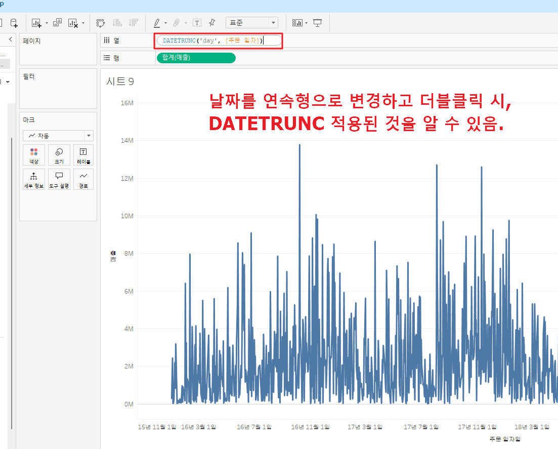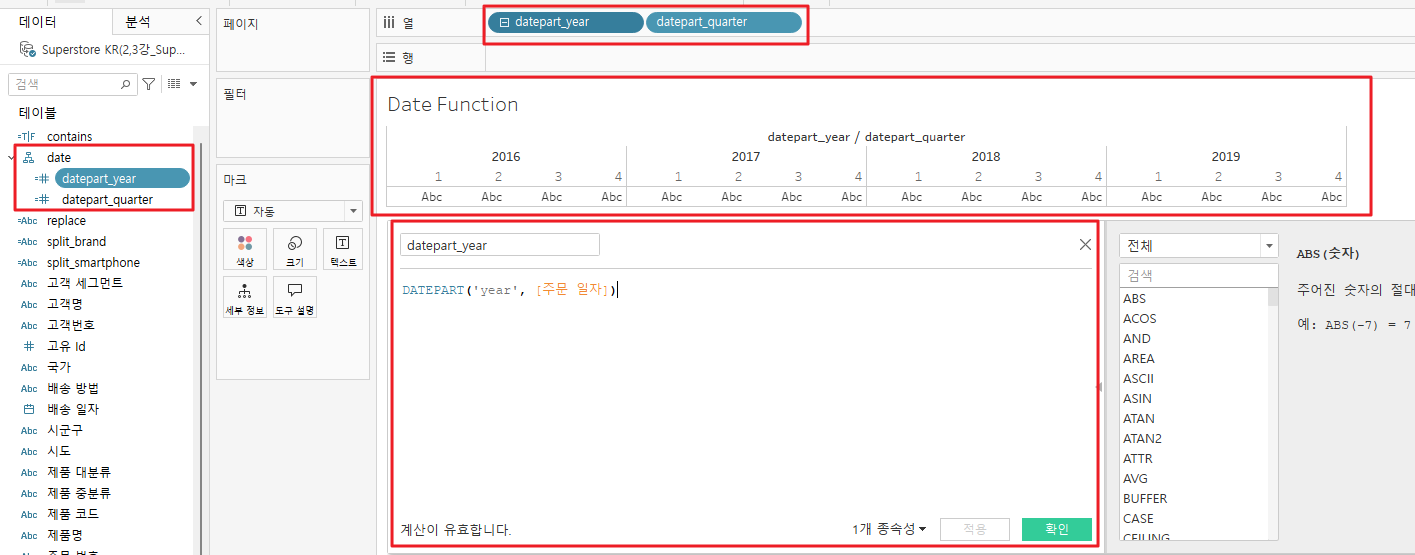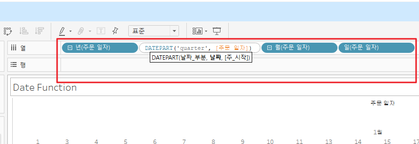- 기본적으로 날짜 데이터를 다룰 때 주로 사용되며, 알약(필드명)을 마우스로 드릴다운 하거나 드래그&드롭 할때 해당 함수가 적용된다.